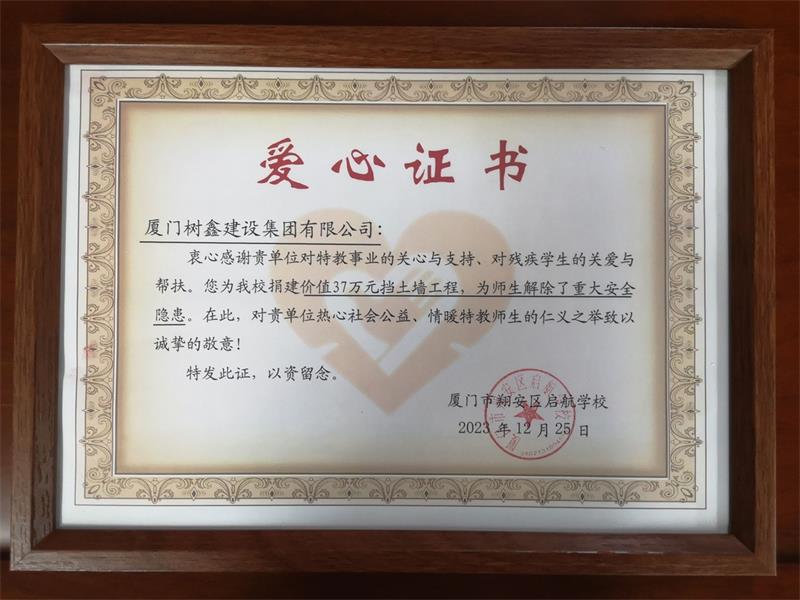 12月28日上午,廈門樹鑫建設(shè)集團(tuán)有限公司董事長陳開樹一行出席了廈門啟航特殊學(xué)校的師生們精心安排的捐贈儀式,一同出席儀式的還有安徽省駐廈門辦事處主任楊承東主任、翔安區(qū)教育局領(lǐng)導(dǎo)莊江藝副局長、翔安區(qū)殘聯(lián)領(lǐng)導(dǎo)趙德全副理事長和廈門啟航特殊學(xué)校校長李森。